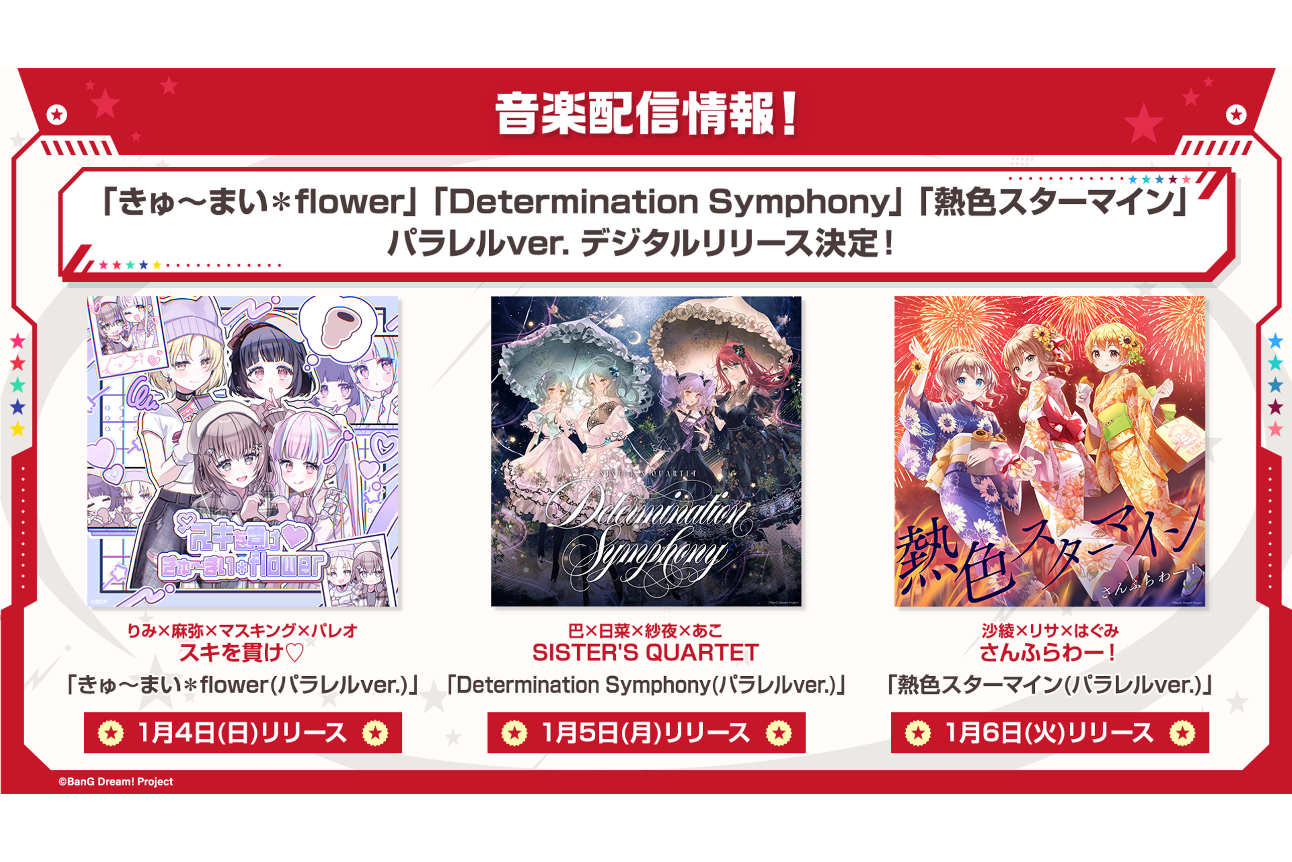 スキを貫け♡「きゅ〜まい*flower(パラレルver.)」、SISTER'S QUARTET「Determination Symphony(パラレルver.)」、さんふらわー!「熱色スターマイン(パラレルver.)」のデジタルリリースが決定!