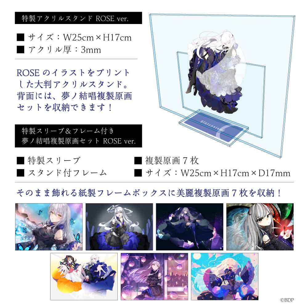 ブシロード オンラインストア限定で販売となる1,000個限定グッズ付特装盤にはキャラクターデザインを担当した米室氏のオリジナルジャケットイラストを使用したフラワーアクリルスタンド、7名のイラストレーターにより描かれた夢ノ結唱ROSEの特製ペーパーフレーム付き複製原画セットが同梱されています。