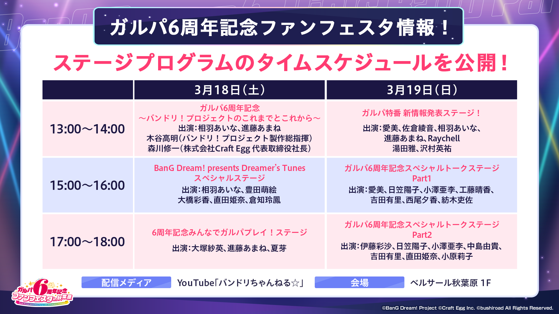 愛美(戸山香澄 役)、佐倉綾音(美竹蘭 役)、相羽あいな(湊友希那 役)、進藤あまね(倉田ましろ 役)、Raychell(レイヤ 役)、湯田雅(ガルパプロデューサー)、沢村英祐(ガルパコンテンツプロデューサー)