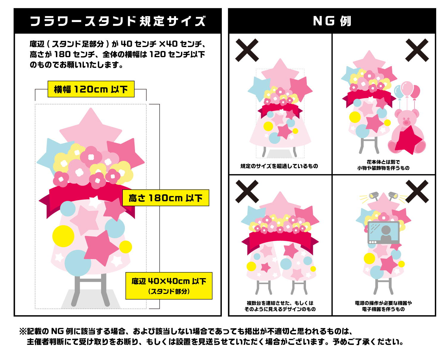 ※記載のNG例に該当する場合、および該当しない場合であっても掲出が不適切と思われるものは、主催者判断にて受け取りをお断り、もしくは設置を見送らせていただく場合がございます。予めご了承ください。