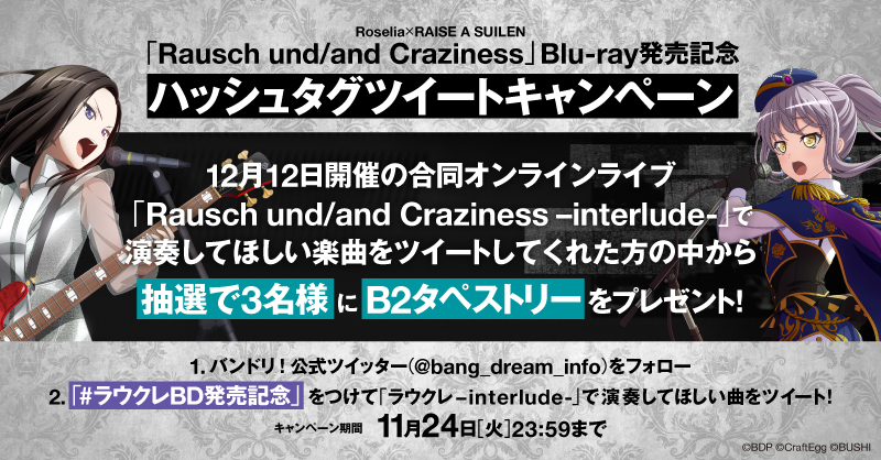 ②ハッシュタグ【#ラウクレBD発売記念】をつけて、「Rausch und/and Craziness -interlude-」で演奏してほしい曲をツイート!