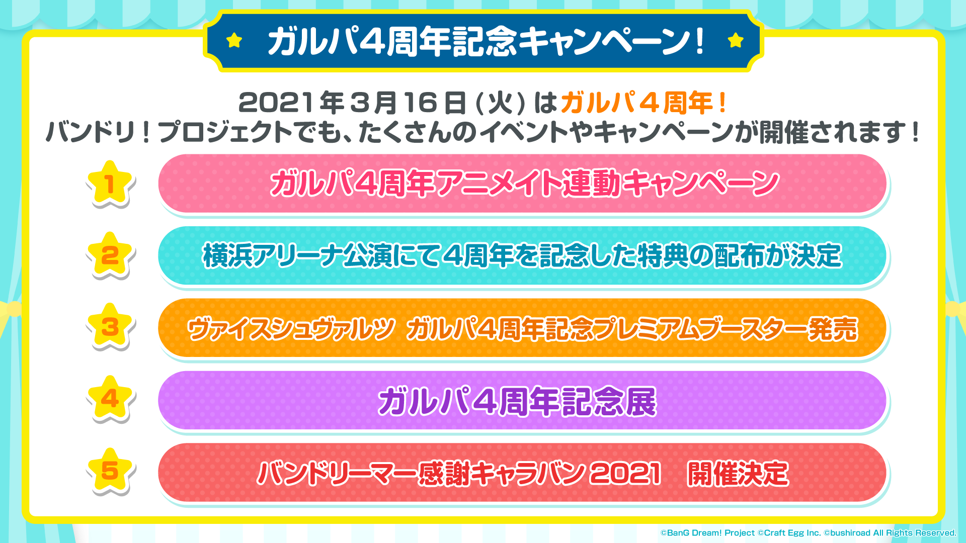 バンドリ!とガルパのこれからや、4周年アップデート情報やキャンペーン情報を発表予定です。