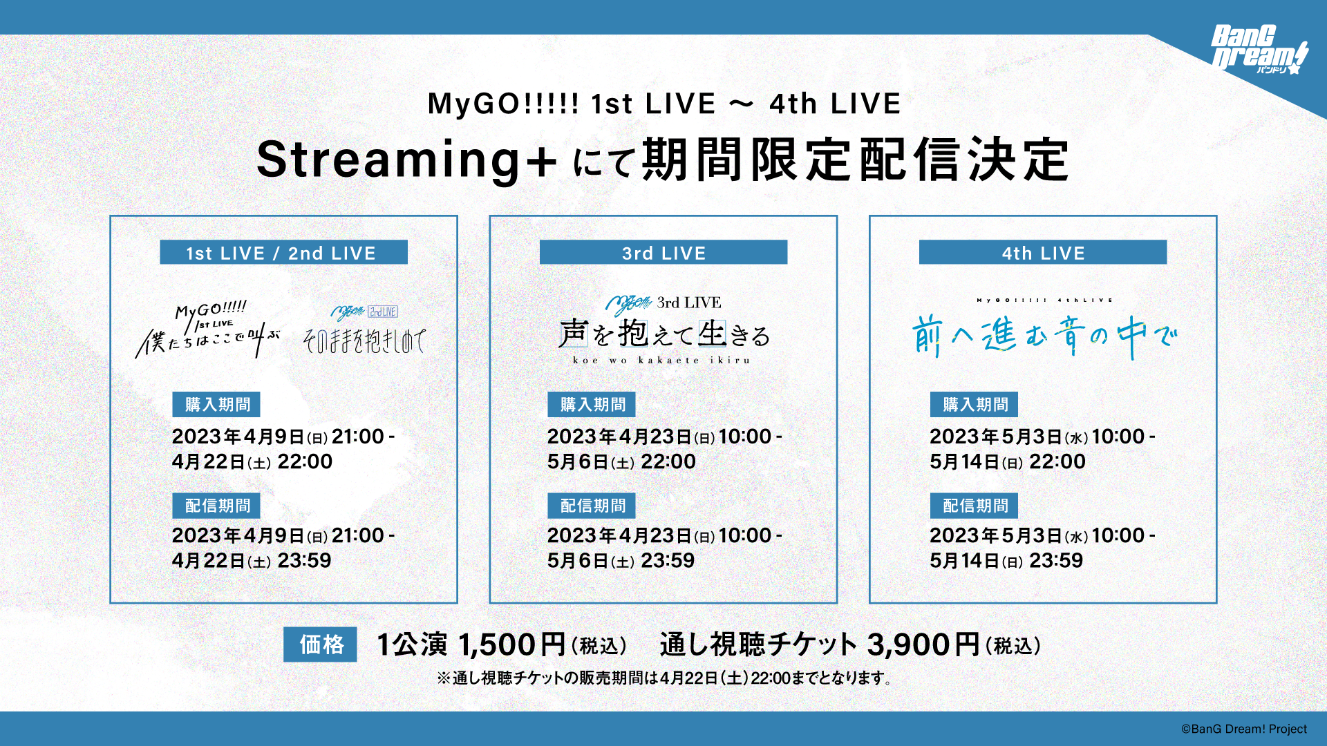 アニメ新シリーズ「BanG Dream! It’s MyGO!!!!!」の放送を記念して、MyGO!!!!! 1st LIVE「僕たちはここで叫ぶ」からMyGO!!!!! 4th LIVE「前へ進む音の中で」を振り返る、特別有料配信が決定しました。