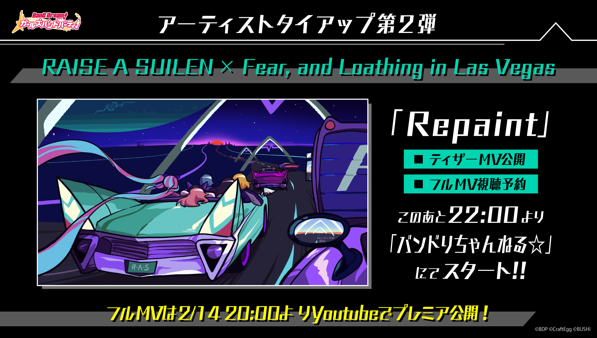 そして、こちらも初披露となったラスベガス提供楽曲の「Repaint」は、公演終了後22時より、YouTubeにてアニメーションMVフルバージョンの視聴予約が開始された。視聴予約ページでは同MVのティザームービーが公開、フルバージョンは2月14日20時よりプレミア公開予定だ。
