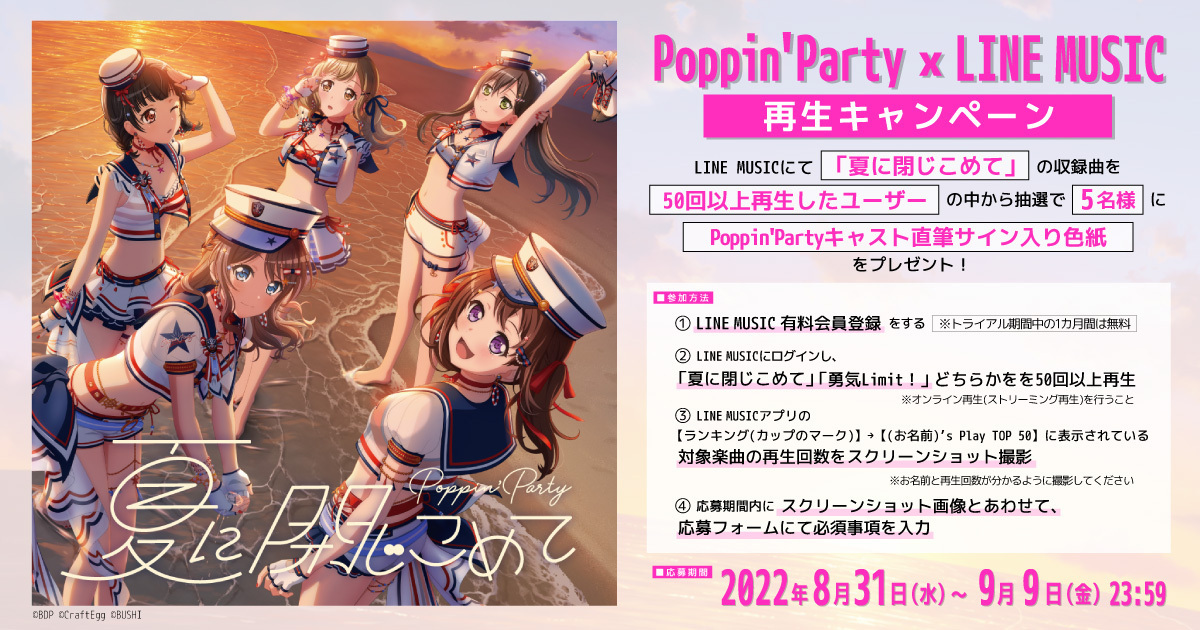Poppin'Party 18th Single「夏に閉じこめて」のリリースを記念して、LINE MUSICにて「夏に閉じこめて」「勇気Limit!」どちらかを50回以上再生した方の中から、抽選で5名様にPoppin'Partyキャストの直筆サイン入り色紙をプレゼント!