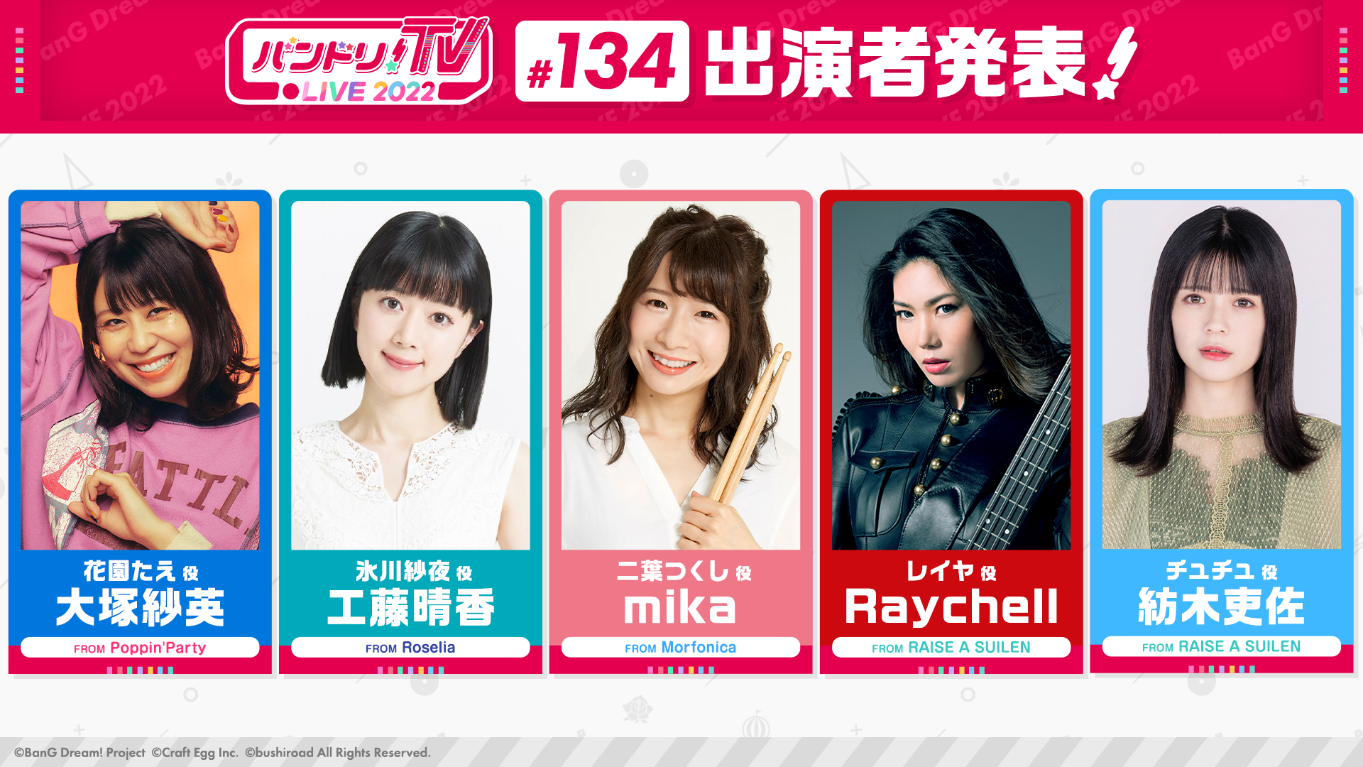 大塚紗英(花園たえ 役)、工藤晴香(氷川紗夜 役)、mika(二葉つくし 役)、Raychell(レイヤ 役)、紡木吏佐(チュチュ 役)