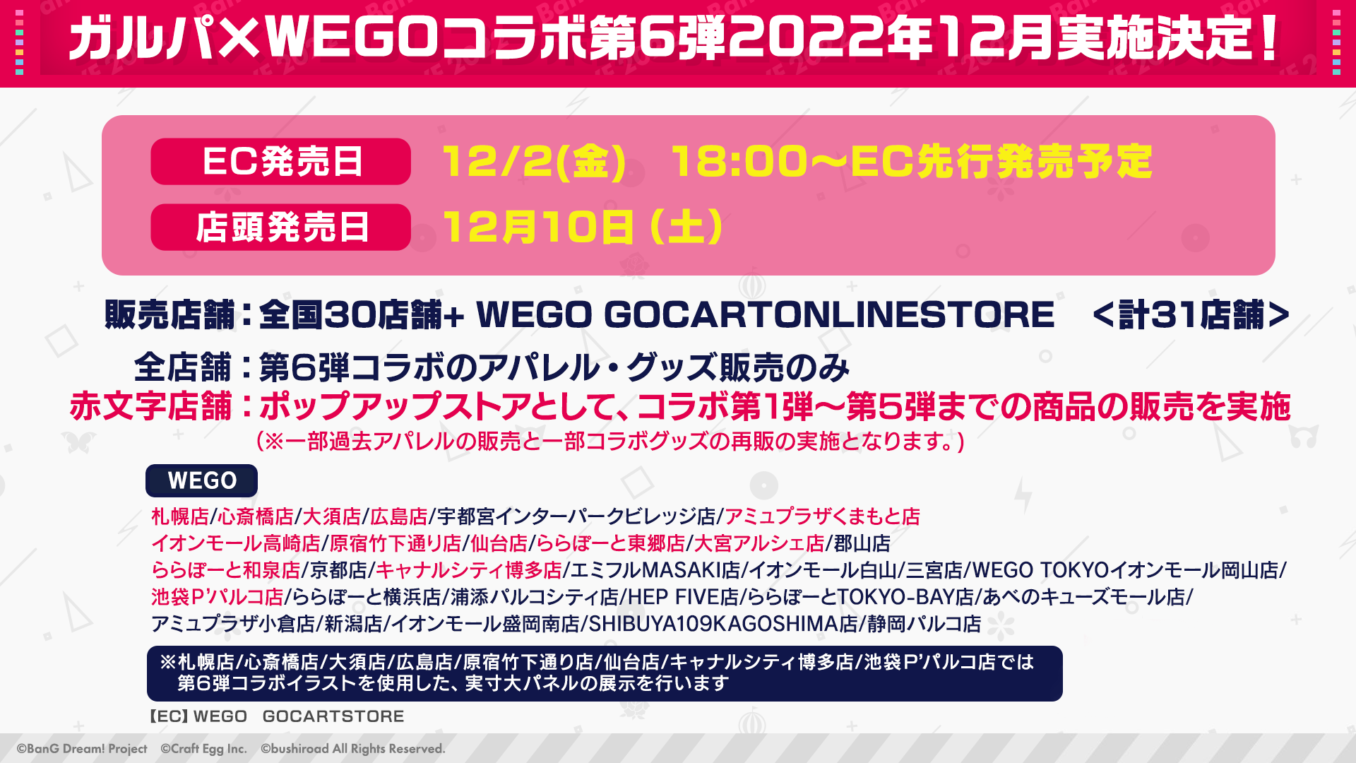 12月10日(土)〜18日(日)の期間、コラボ商品の発売を記念して、全国のWEGO店舗にて、ガルパアプリのスタート画面をご提示で店内商品が10%OFFになるキャンペーンを開催!