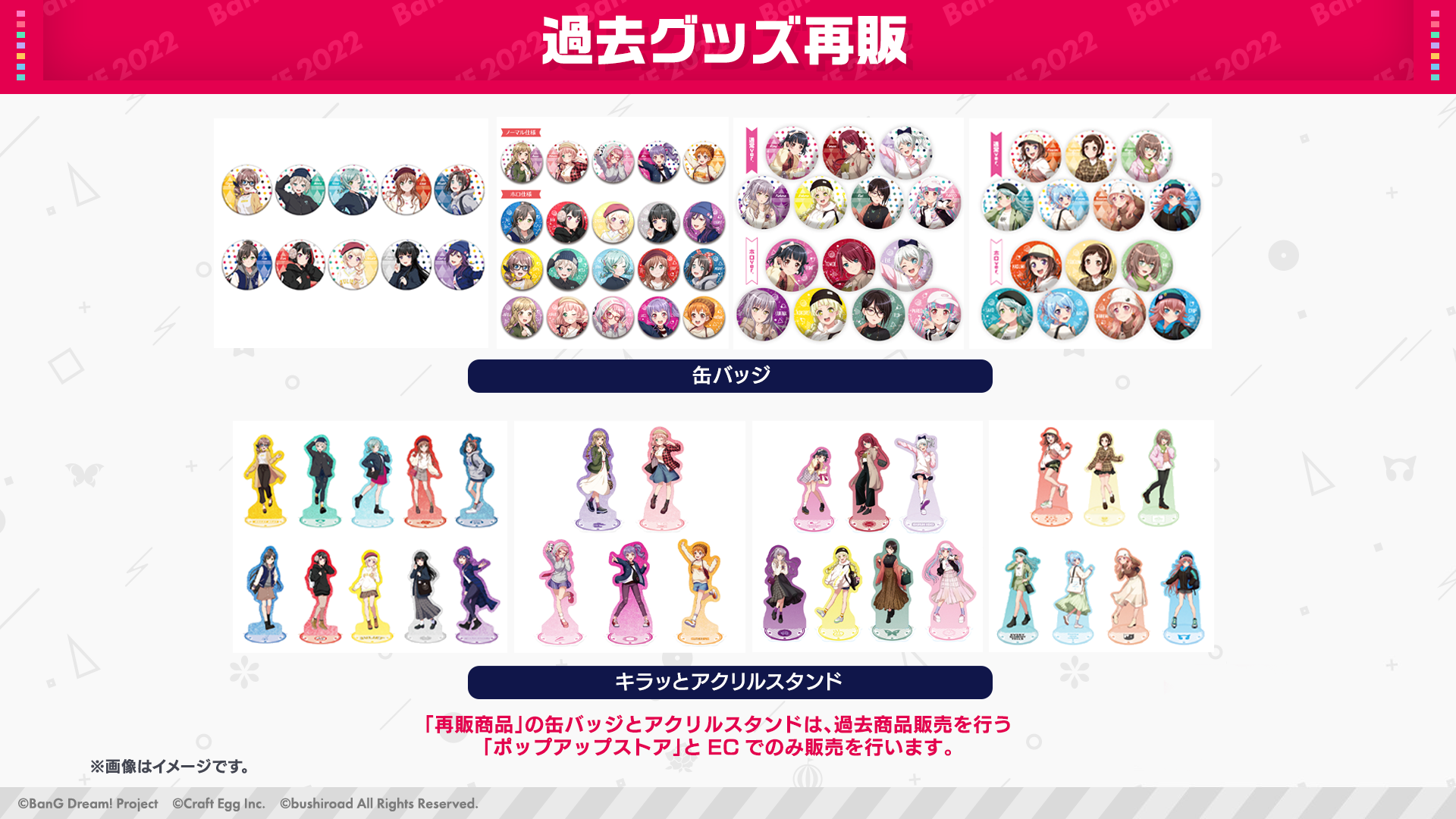 ※過去再販商品の缶バッジとアクリルスタンドはポップアップストア、WEGO EC でのみの販売となります。
