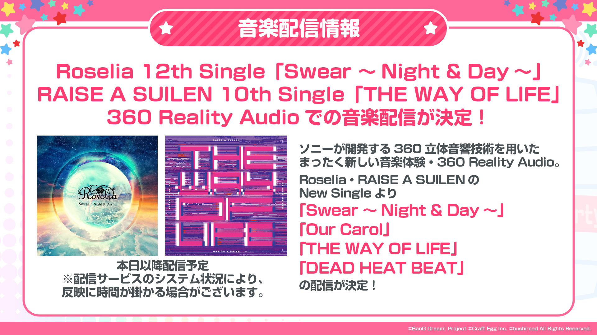 Roselia「Swear 〜Night & Day〜」、RAISE A SUILEN「THE WAY OF LIFE」の360Reality Audio配信が決定!