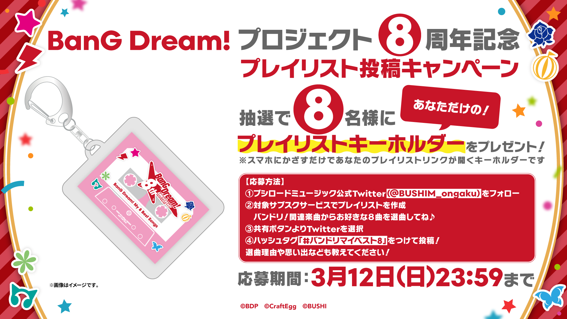 対象サブスクサービスにて、バンドリ!関連楽曲からお好きな8曲を選び、プレイリストを作成し、ハッシュタグ「#バンドリマイベスト8」を付けてTwitterにシェアいただいた方の中から抽選で【あなただけのプレイリストキーホルダー】をプレゼント!