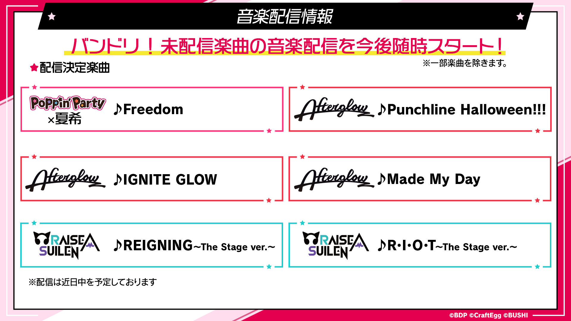 これまで音楽配信サービスで未配信であったバンドリ!楽曲の中から、随時配信が決定しました。(※一部楽曲を除く)