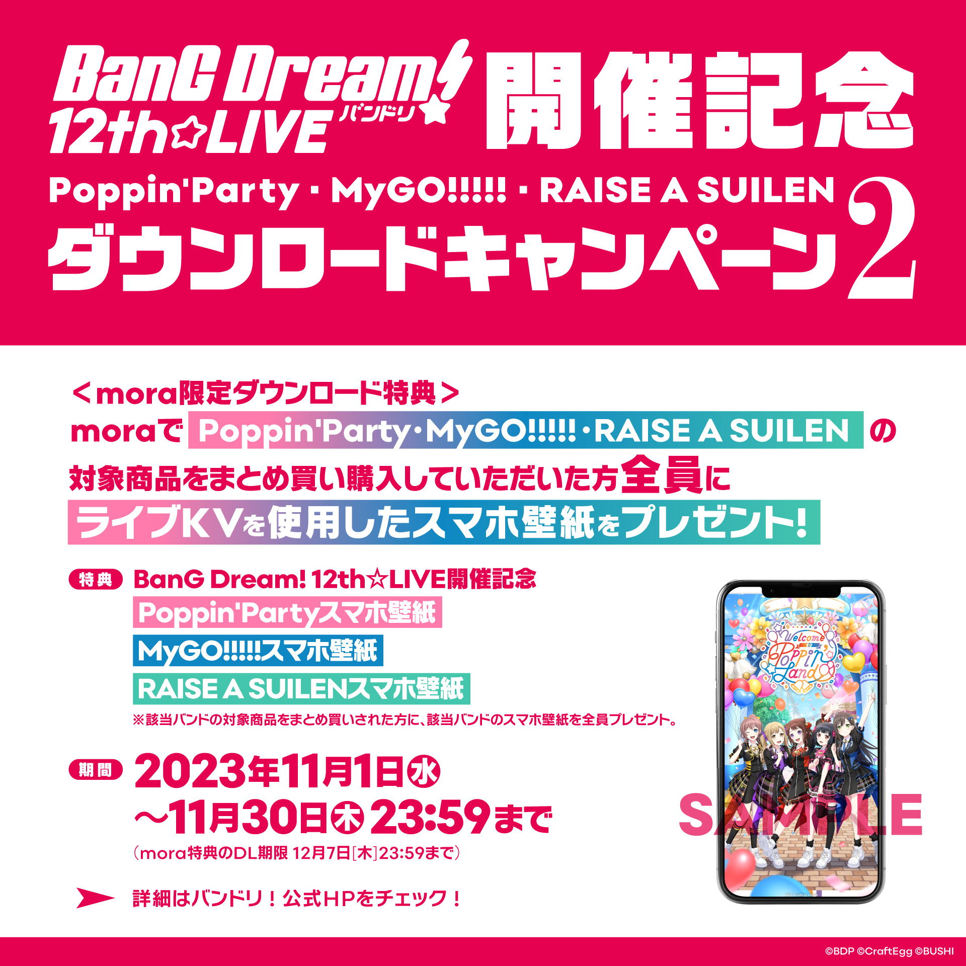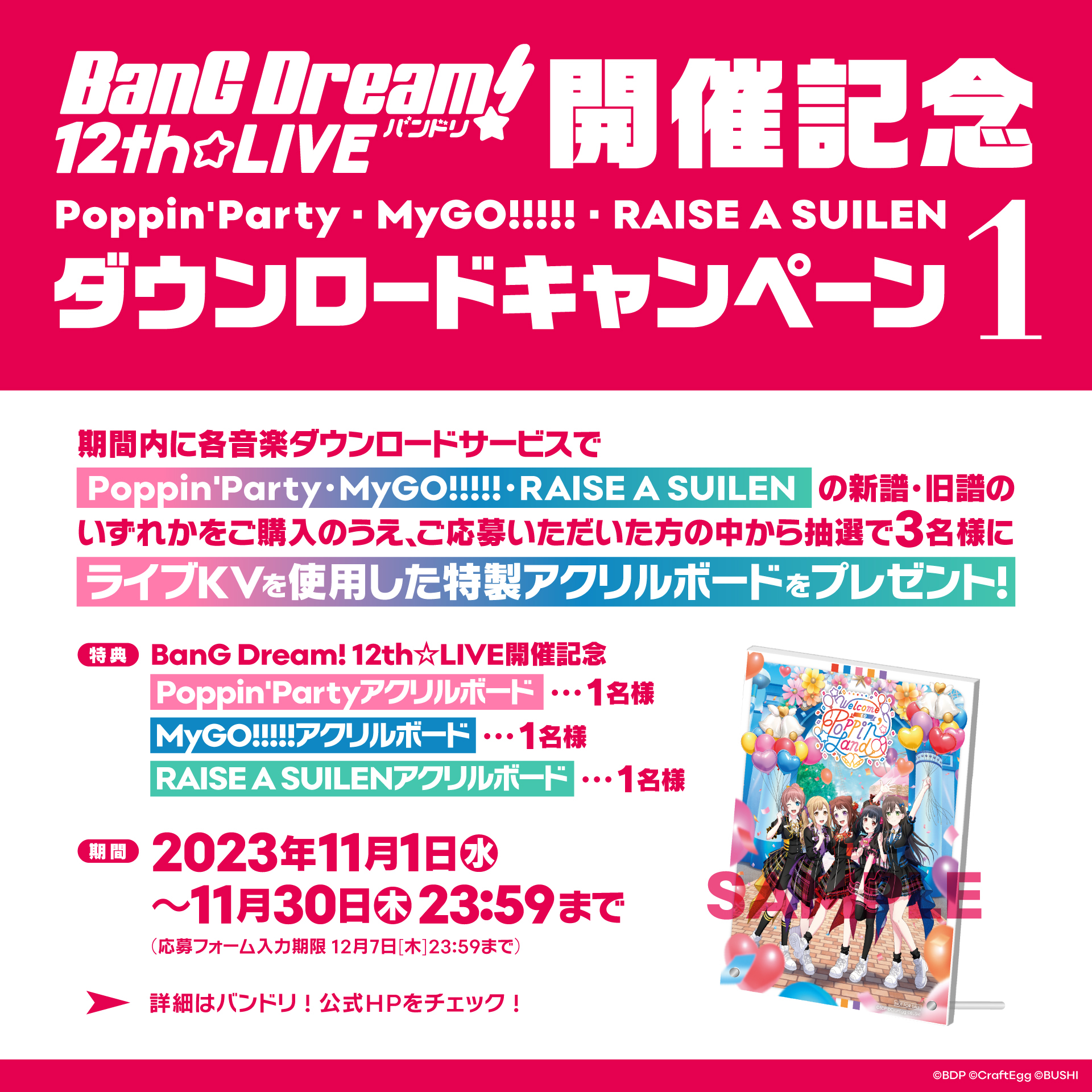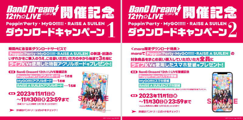 BanG Dream! 12th☆LIVEの開催記念を記念して、Poppin'Party・MyGO!!!!!・RAISE A SUILENの楽曲ダウンロードキャンペーンを実施いたします!