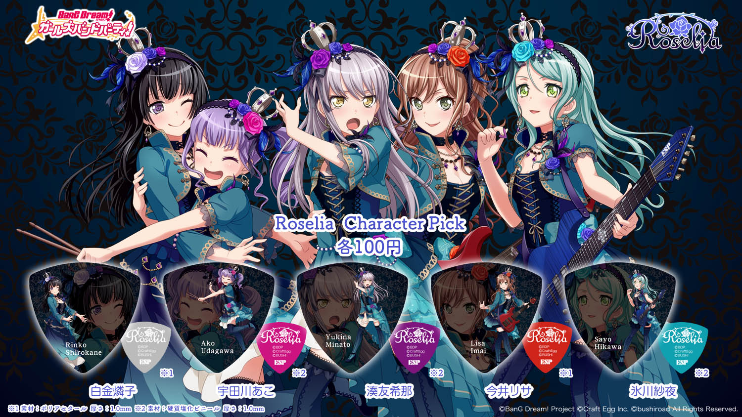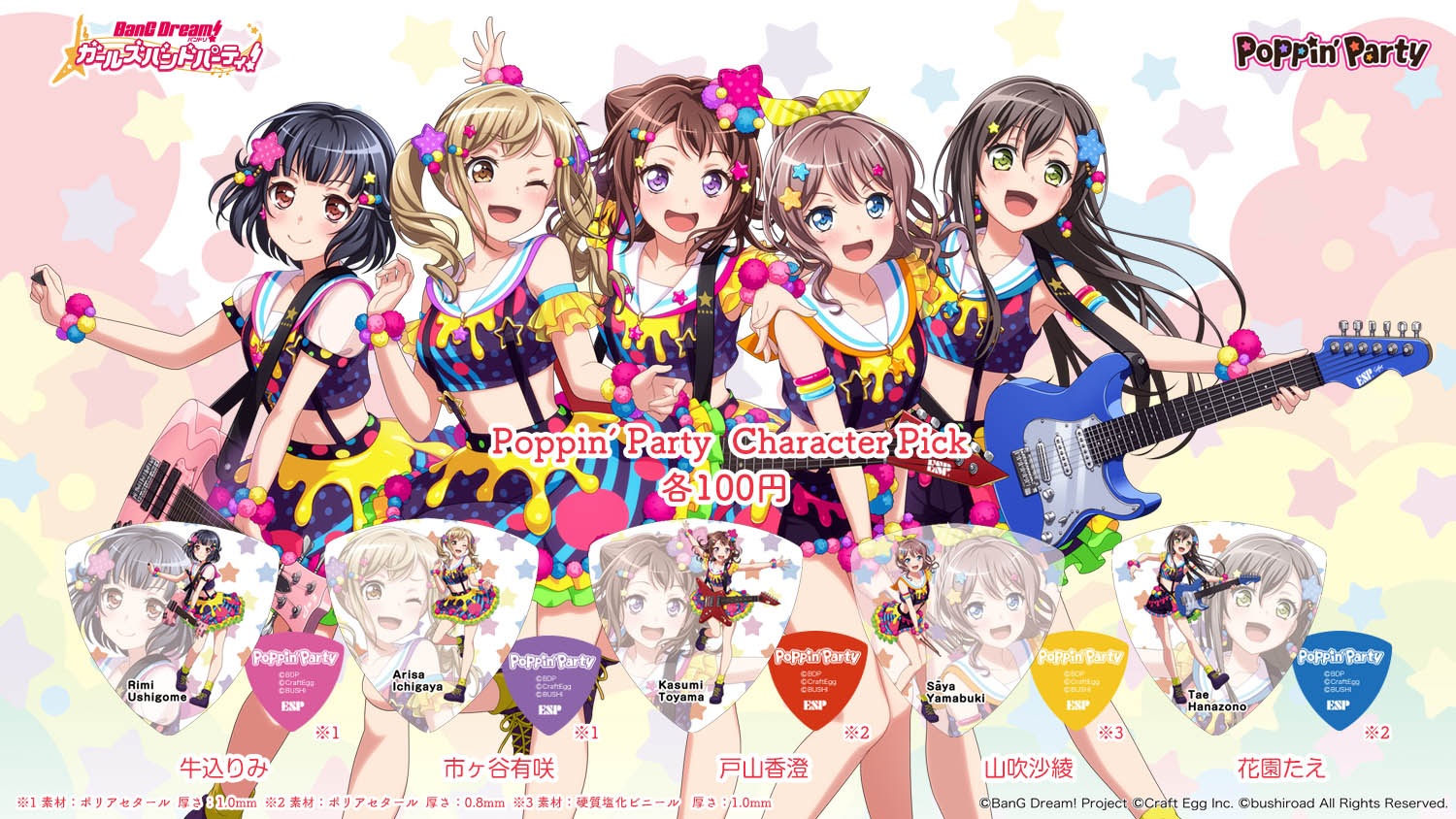 News 2018.06.15グッズ Poppin'Party&Roseliaのピックが新デザインで発売決定! 大好評のピックが、ついにPoppin'Party&Roseliaの新衣装で発売決定!ぜひ全種類ゲットしてくださいね☆ ■バンドリ! ガールズバンドパーティ! キャラクターピック Poppin'Party(5種)/Roselia(5種) 各100円(税抜) 2018年7月下旬より、全国の楽器店にて随時発売! SHARE 関連アーティスト Poppin'Party Roselia