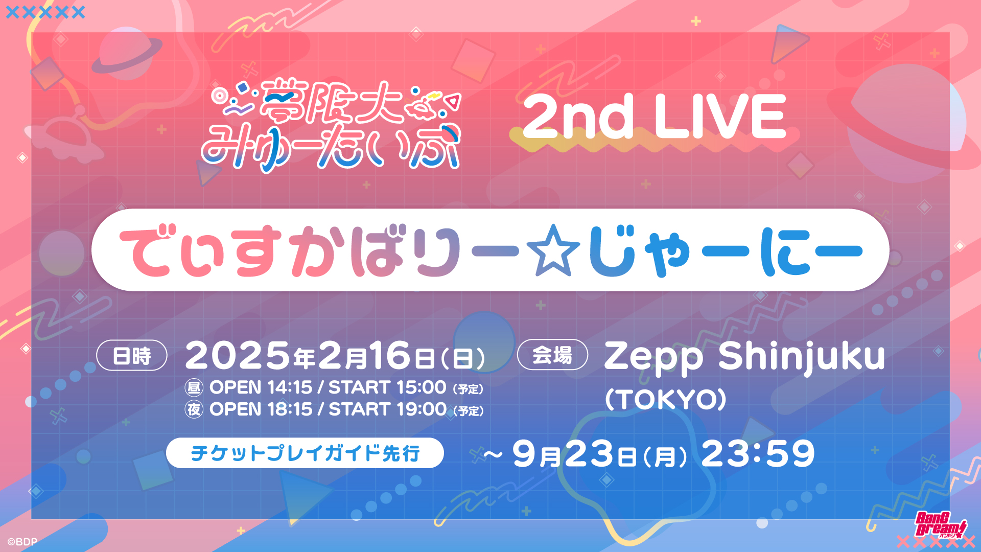 2025年2月16日(日)に開催される夢限大みゅーたいぷ 2nd LIVEのチケットプレイガイド先行は 9月23日(月)23:59 まで受付中です。