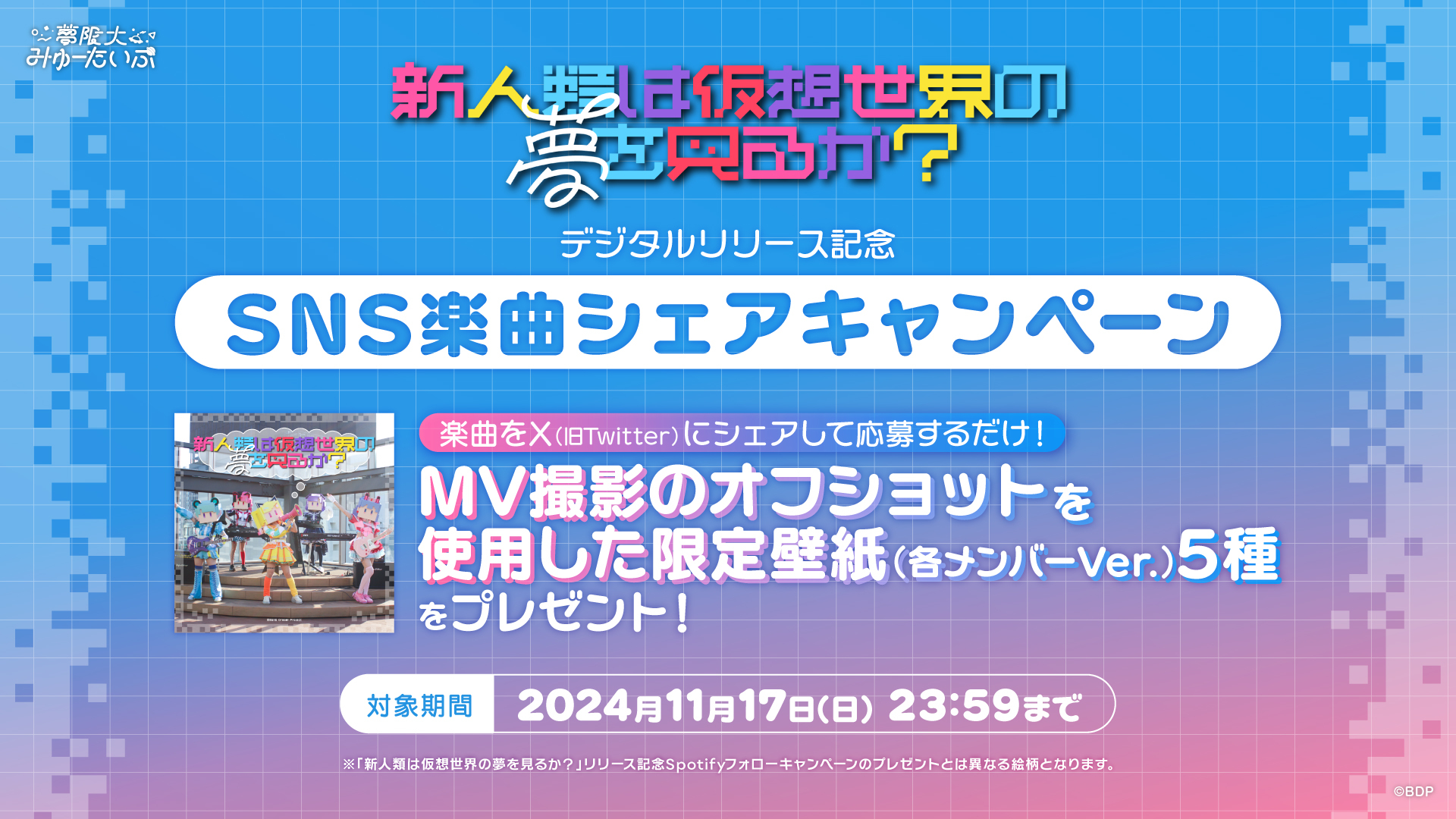 新曲「新人類は仮想世界の夢を見るか?」の楽曲をXでシェアして応募するとMV撮影のオフショットを使用した壁紙が貰えるキャンペーンを開催中です。