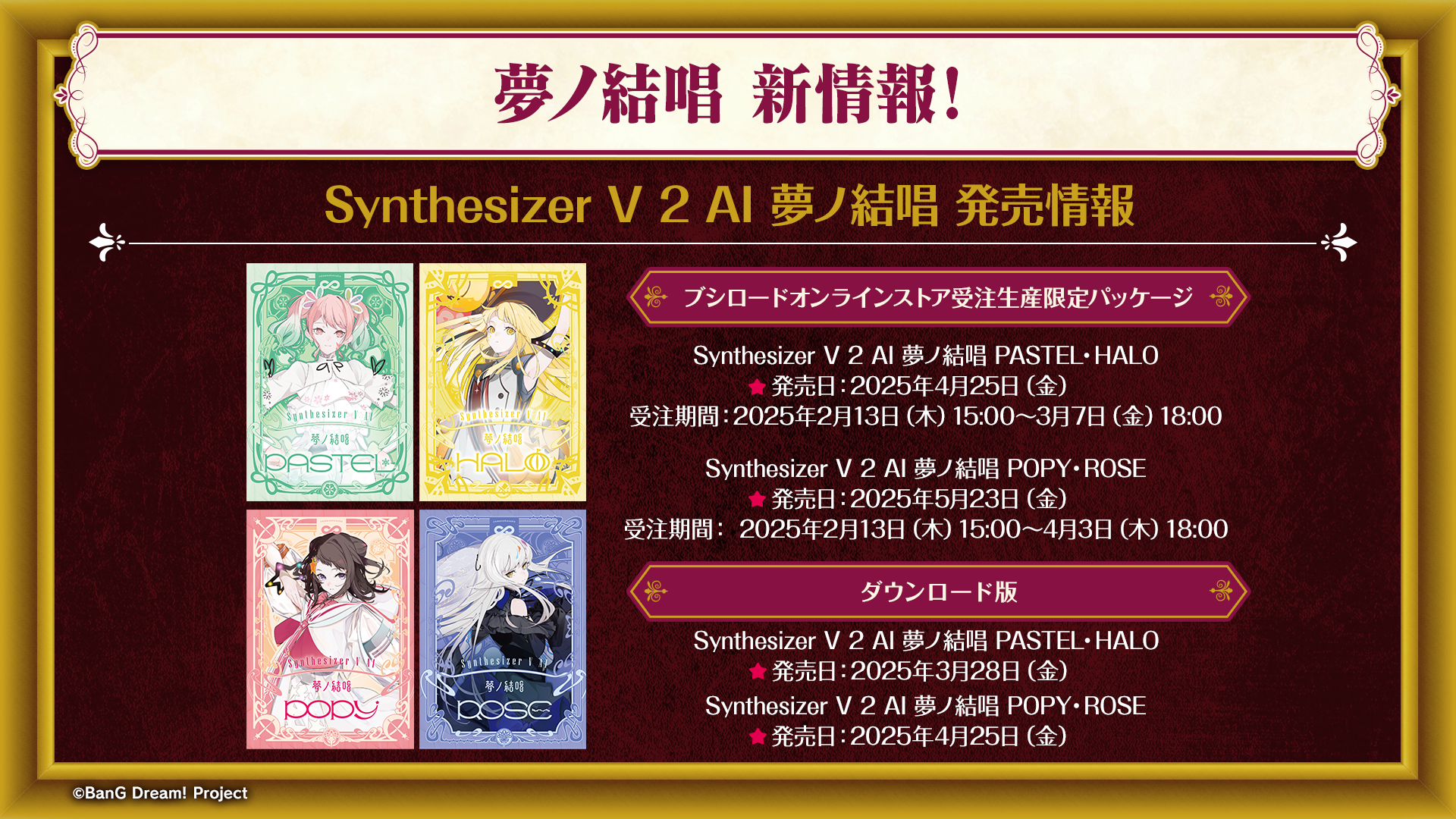 商品ページ:https://bang-dream.com/discographies/4034 - Synthesizer V AI 夢ノ結唱POPY・ROSEをお持ちの方に下記互換版の提供及びアップグレードコードの優待販売を予定しています。