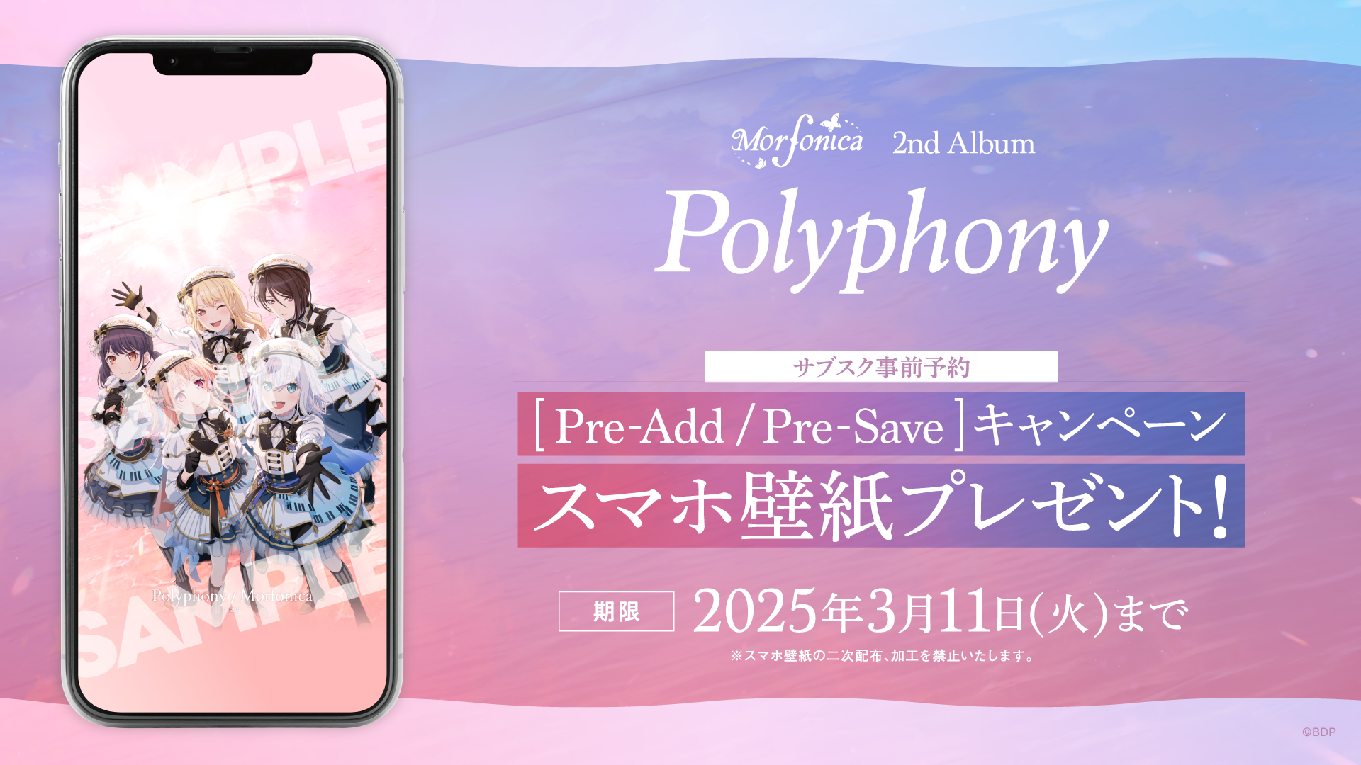 Morfonica 2nd Album「Polyphony」のデジタルリリースを記念して、Apple Music・Spotify事前予約 (Pre-Add / Pre-Save) キャンペーンを実施いたします。Apple MusicもしくはSpotifyにて期間内に下記ページからPre-Add / Pre-Save (ライブラリ事前予約) をしていただいた全員に「スマホ壁紙」をプレゼント。