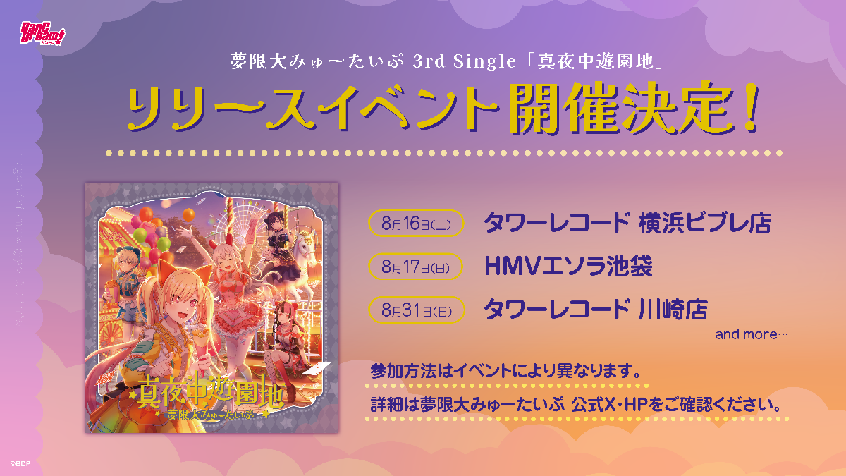 2025年9月3日(水) 夢限大みゅーたいぷ 3rd Single「真夜中遊園地」のリリースを記念し、「ゆめみた真夜中アチアチ集会」と「特典お渡し会」の開催が決定しました!