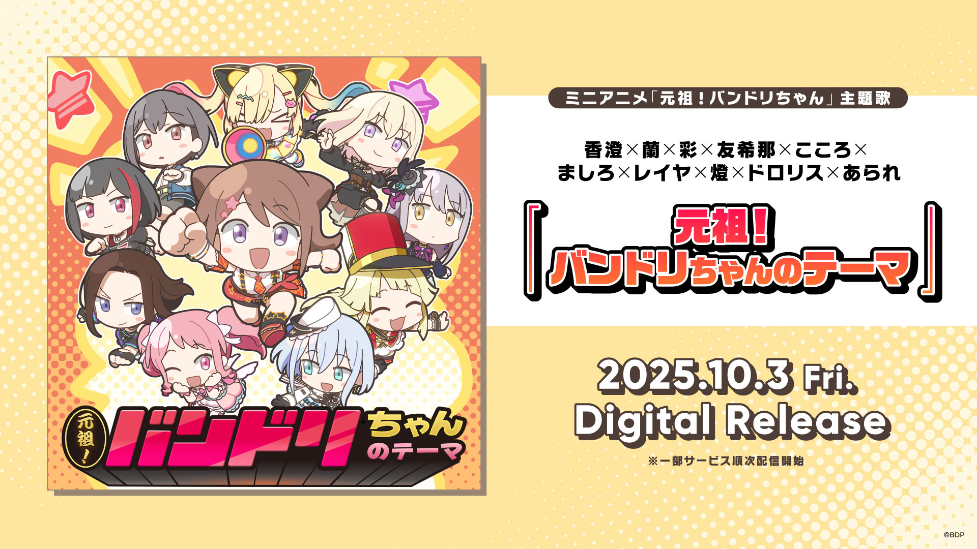 2025年10月より放送のミニアニメ「元祖!バンドリちゃん」主題歌、香澄×蘭×彩×友希那×こころ×ましろ×レイヤ×燈×ドロリス×あられ「元祖!バンドリちゃんのテーマ」がデジタルリリース!
