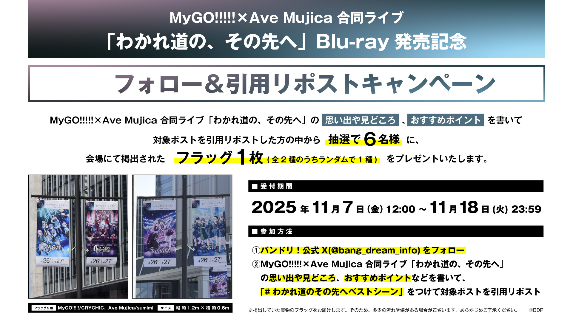 今年4月に開催された、MyGO!!!!!×Ave Mujica 合同ライブ「わかれ道の、その先へ」の思い出や見どころ、おすすめポイントを書いて対象ポストを引用リポストした方の中から抽選で 6 名様に、会場にて掲出されたフラッグ1枚(全2種のうちランダムで1種)をプレゼントいたします。