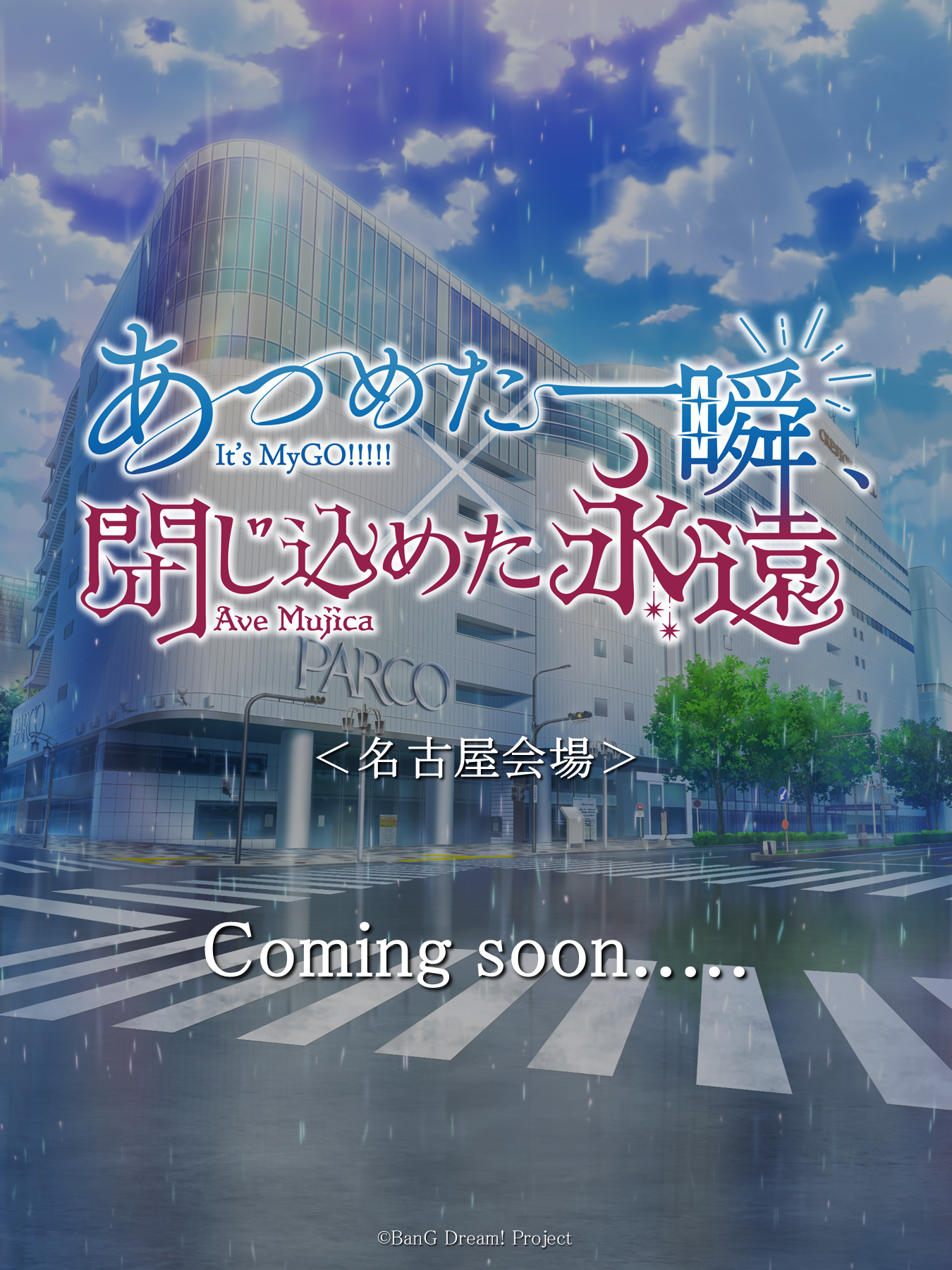 2026年1月31日(土)~2026年2月22日(日) ・TVアニメ「BanG Dream! It's MyGO!!!!!」パート:2026年1月31日(土)~2026年2月9日(月) ※入場は閉場の30分前まで ※最終日は18:00閉場 |