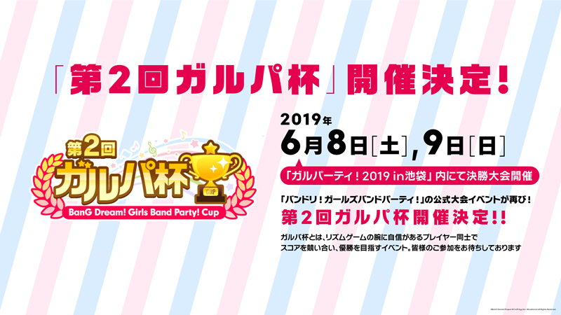 News 2018.12.12ライブ・イベント 「第2回ガルパ杯」開催決定! 「バンドリ! ガールズバンドパーティ!」の公式大会イベント「第2回ガルパ杯」の開催が決定!決勝大会は「ガルパーティ!2019 in池袋」で開催します! 続報をお楽しみに! SHARE