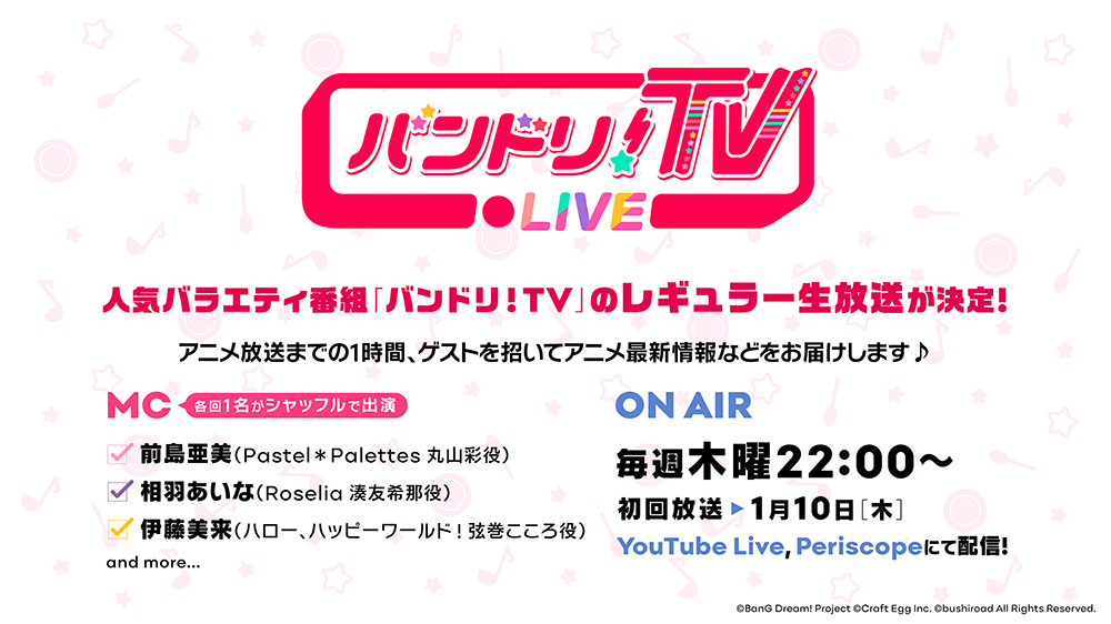 アニメ「BanG Dream! 2nd Season」放送前の1時間、ゲストを招いてアニメ最新情報などをお届けする生配信番組「バンドリ!TV LIVE」は1月10日(木)より放送開始!