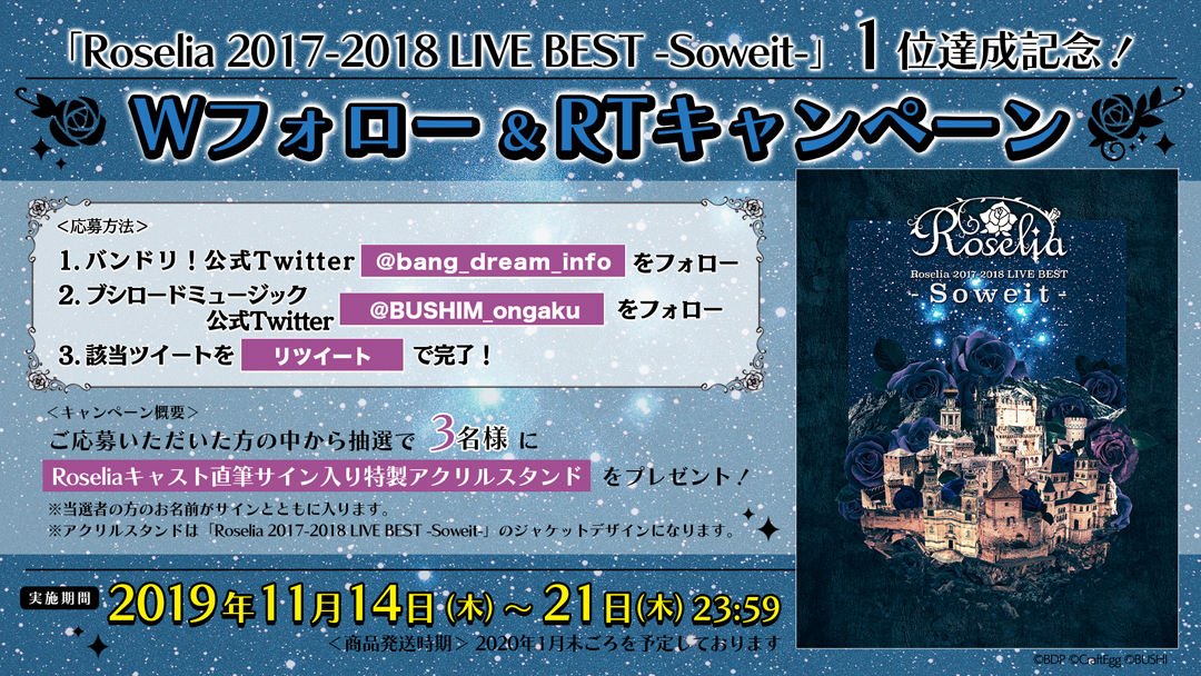 11月6日発売「Roselia 2017-2018 LIVE BEST -Soweit-」が1位を獲得いたしました!