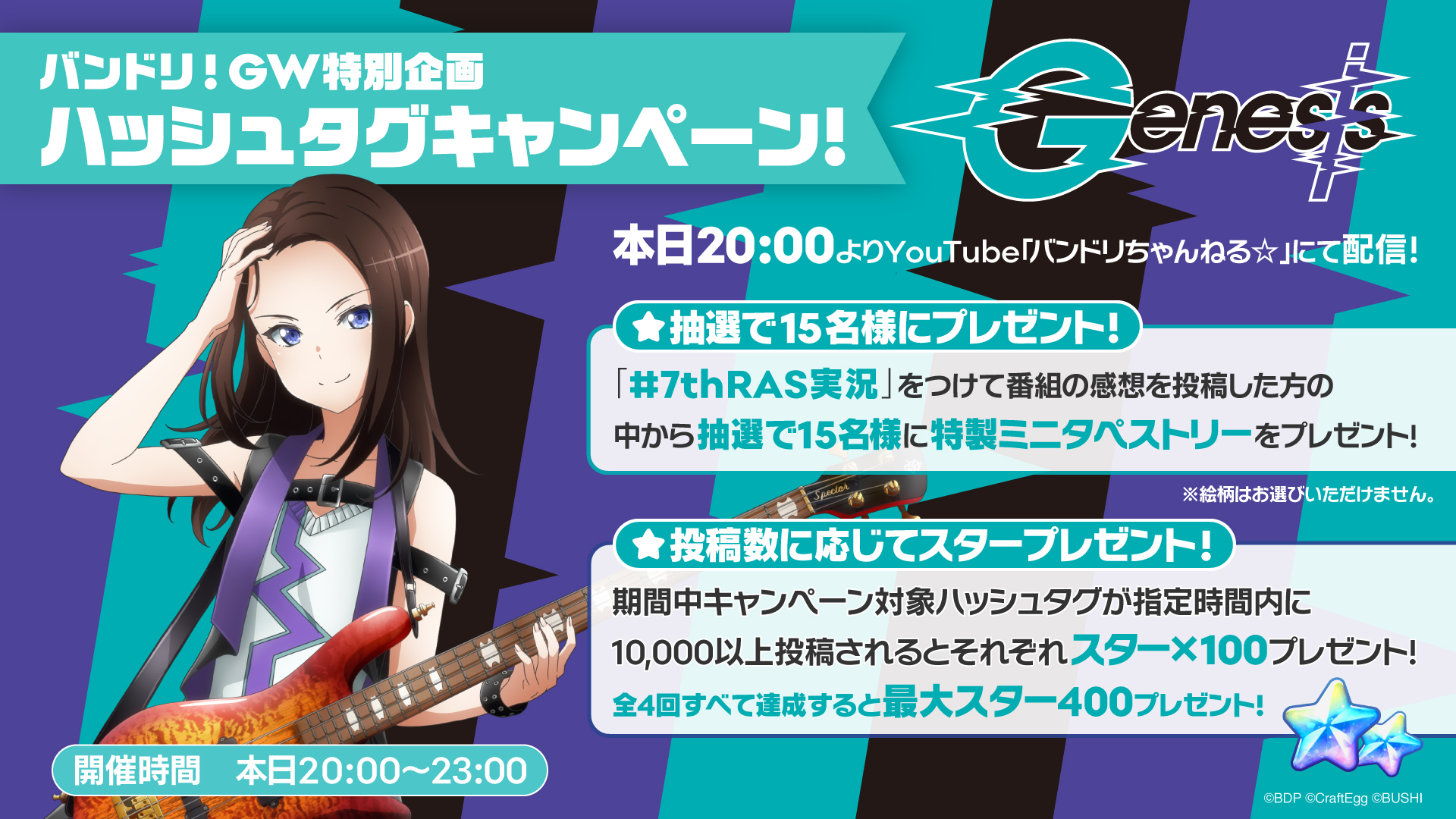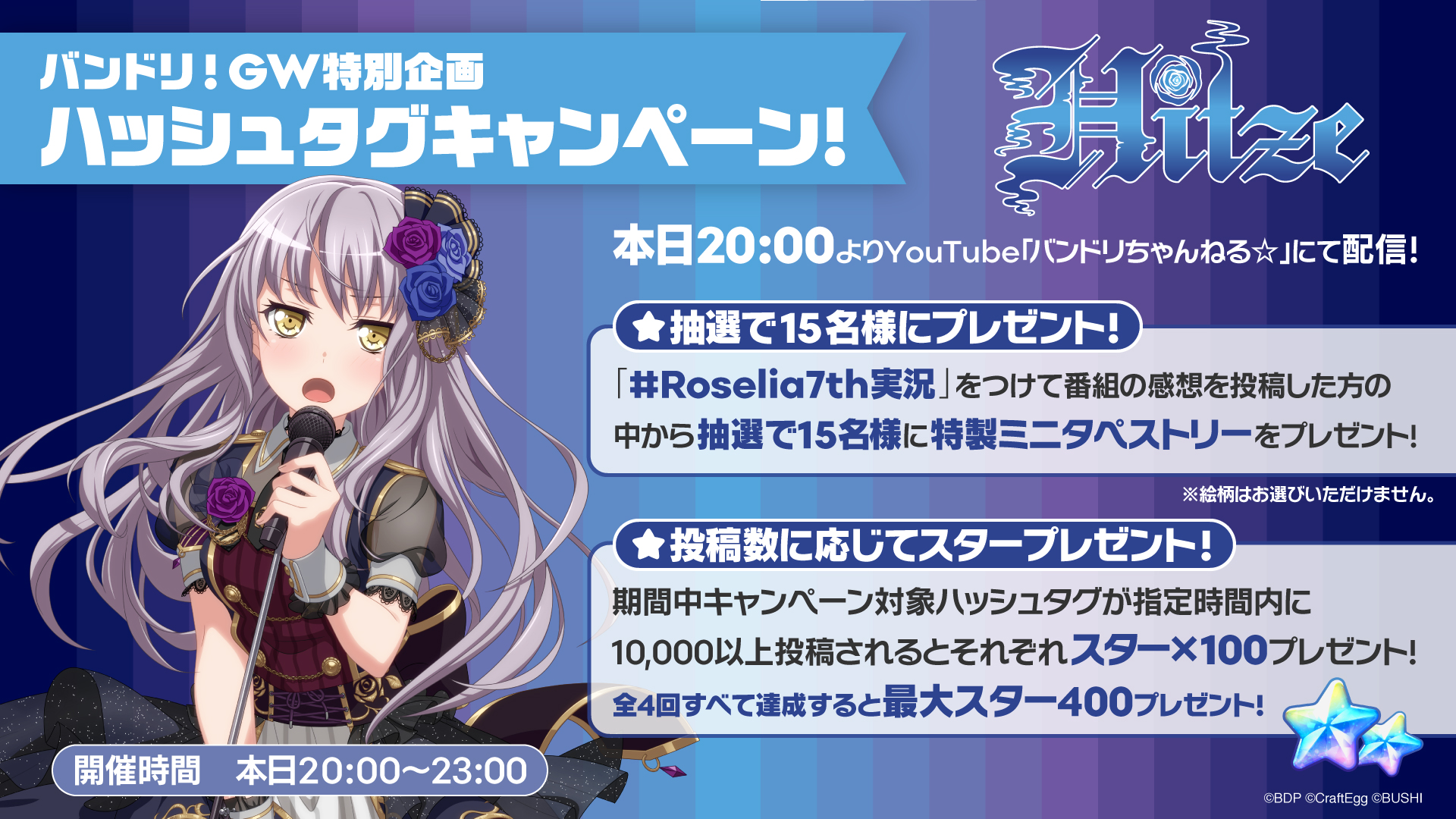 「バンドリ!GW特別企画」の生放送全4回すべて達成すると最大スター400プレゼント!