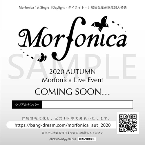 使用可能なシリアルコード:2020年5月27日(水)発売のMorfonica 1st Single「Daylight -デイライト- 」に封入の「最速先行抽選申込券」