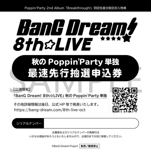 使用可能なシリアルコード:2020年6月24日(水)発売のPoppin'Party 2nd Single「Breakthrough!」に封入の「最速先行抽選申込券」
