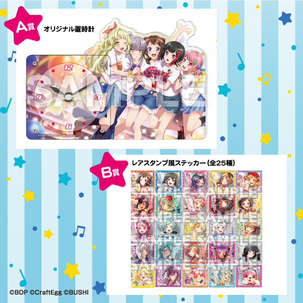 ◇イベント期間中、「バンドリ! ガールズバンドパーティ! ~2020 Summer~ inマルイウェブチャネル」対象商品を税込5,000円以上ご購入いただいたお客様に、抽選でオリジナルグッズA賞:オリジナル置時計(10名様)、B賞:レアスタンプ風ステッカー コンプリートセット(10名様)をプレゼント!