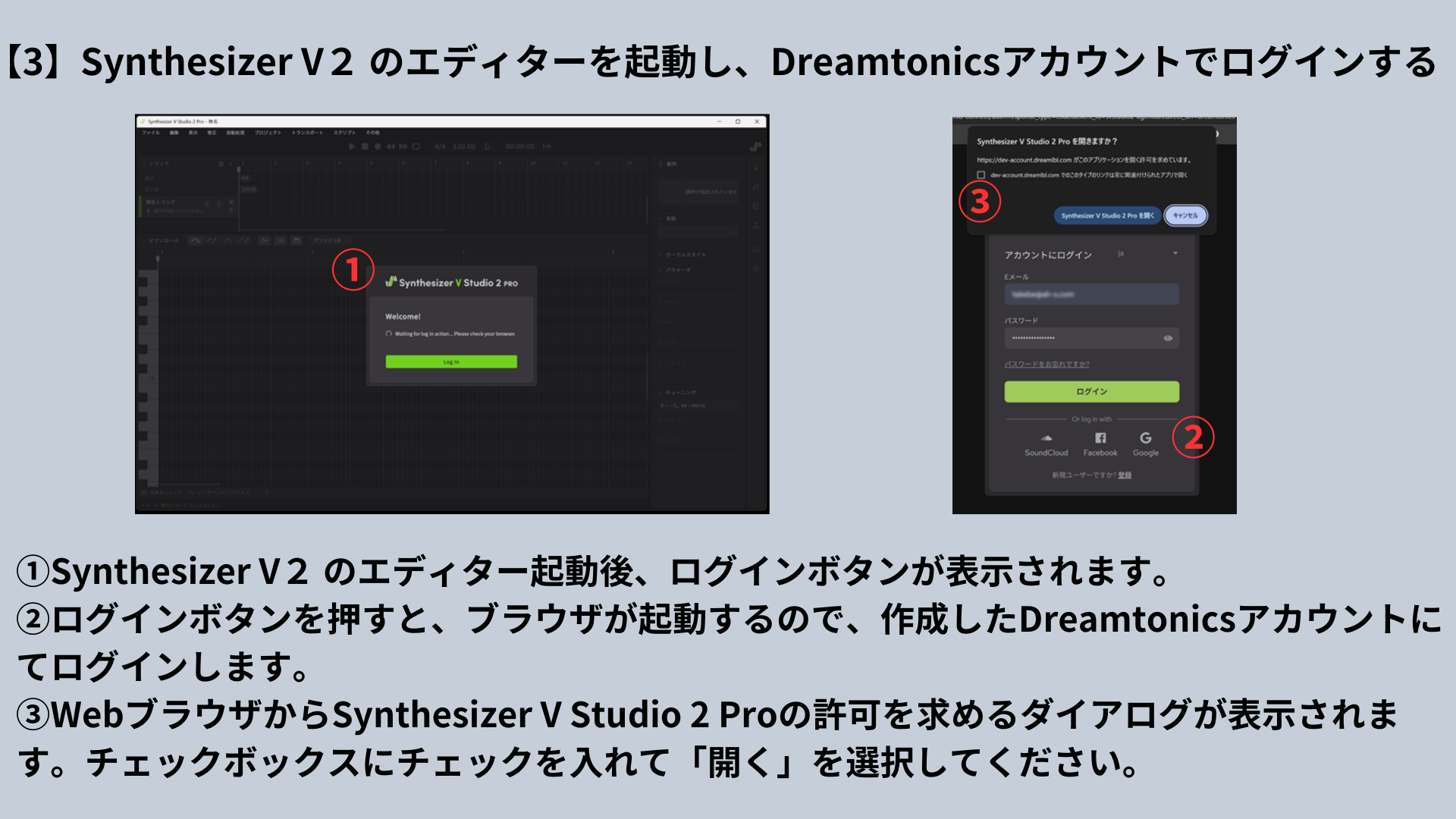 ①Synthesizer V2 のエディター起動後、ログインボタンが表示されます。
