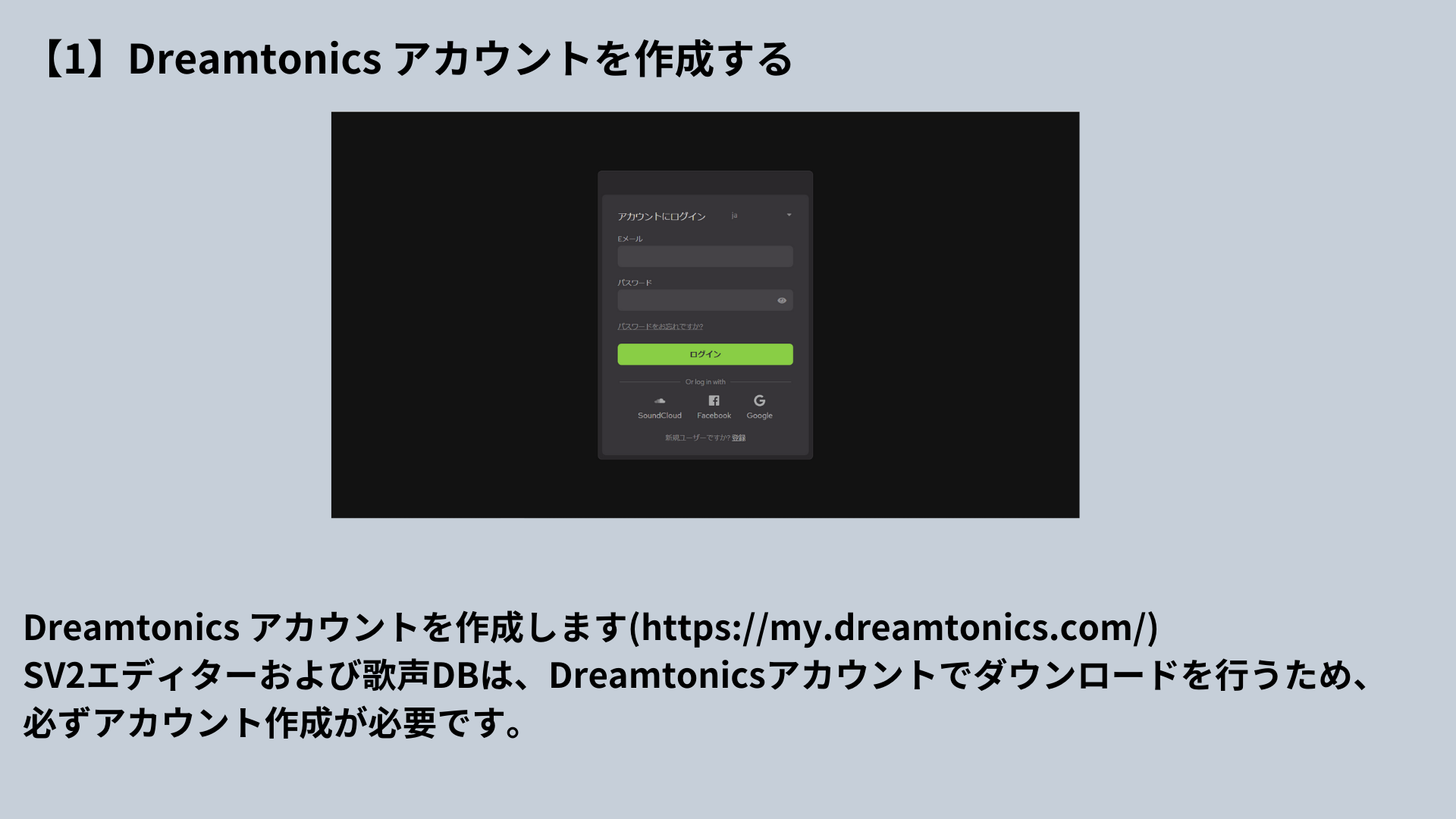 SV2エディターおよび歌声DBは、Dreamtonicsアカウントでダウンロードを行うため、