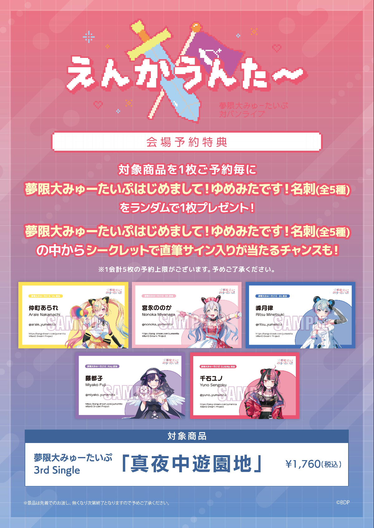 会場にて対象商品ご予約購入ごとに、「夢限大みゅーたいぷ はじめまして!ゆめみたです!名刺 (全5種)」をランダムで1枚プレゼントいたします。